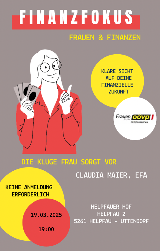 17.02.2025 Einladung zum Vortrag - "Finanzfokus - Die kluge Frau sorgt vor" Mittwoch, 19. März 2025 um 19 Uhr im Helpfauer-Hof, 5261 Helpfau-Uttendorf