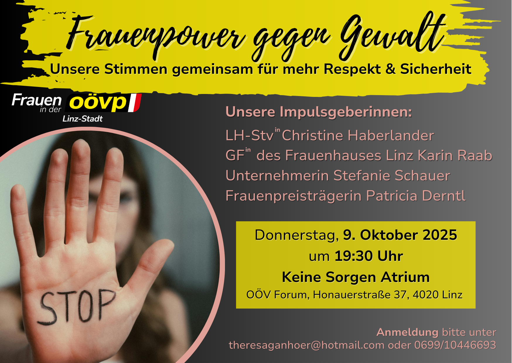 17.09.2025 Frauenpower gegen Gewalt Die Frauen der OÖVP Linz-Stadt laden am Donnerstag, 9. Oktober, um 19:30 Uhr sehr herzlich zu dieser Veranstaltung ein. Anmeldung bitte unter: theresaganhoer@hotmail.com oder 0699/10446693