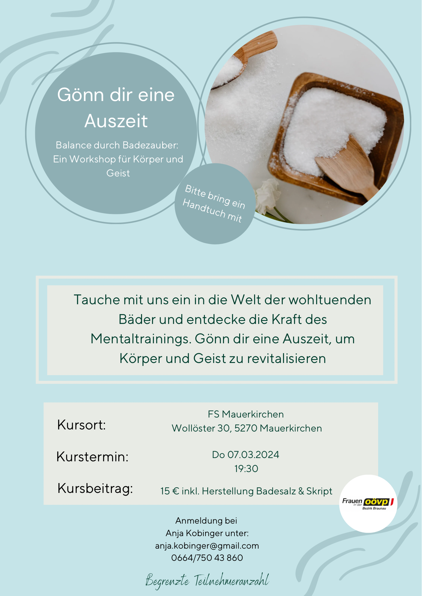 Kursbeitrag: 15 € inkl. Herstellung Badesalz & Skript