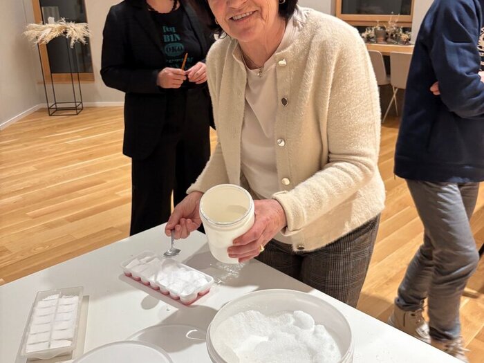 Im Anschluss an den Vortrag hatten die Teilnehmenden die Möglichkeit, das Gehörte praktisch umzusetzen. In einem Workshop wurden gemeinsam Spülmitteltabs hergestellt, was eindrucksvoll zeigte, wie leicht nachhaltige Alternativen selbst hergestellt und in den Alltag integriert werden können.